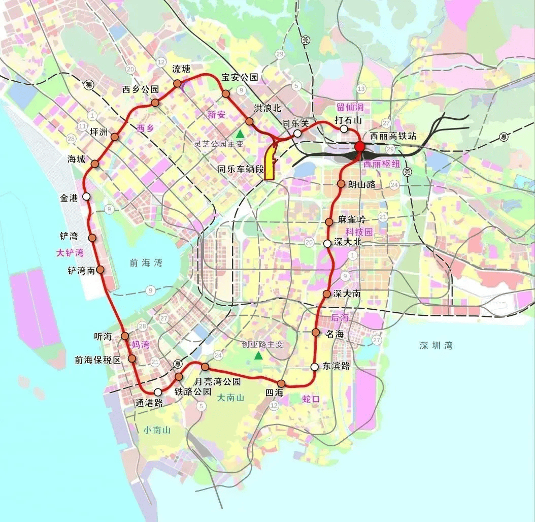 地铁15号线,起自听海路站,止于听海路站,全长32.2公里,设站24座。15号线是西部发展轴上关键交通走廊环形骨干线路,承担宝安与前海、南山中心便捷联系功能,配套支撑西丽综合交通枢纽建设。