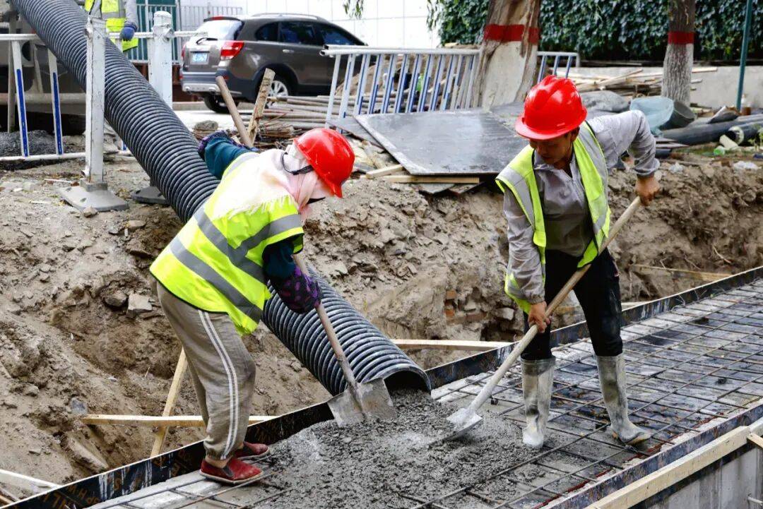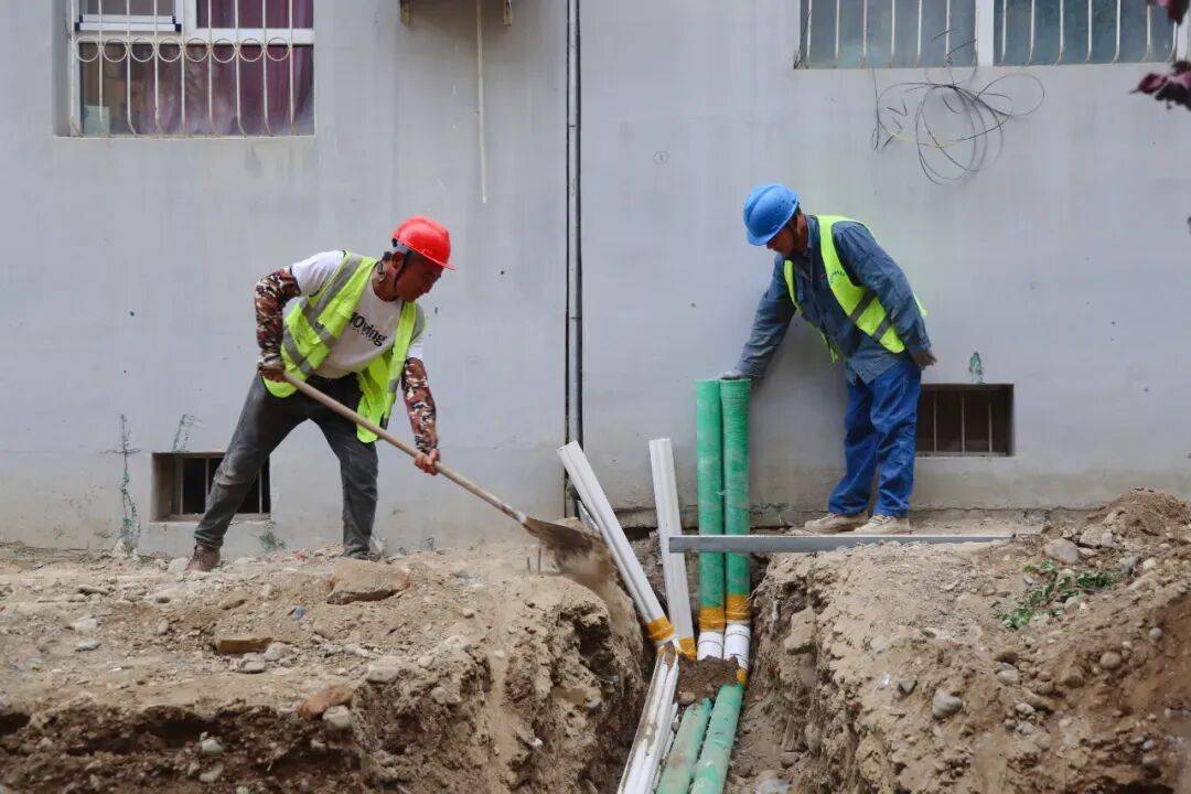 博乐市美居苑小区改造现场,工人铺设线缆管道。来源:博尔塔拉融媒体中心图库