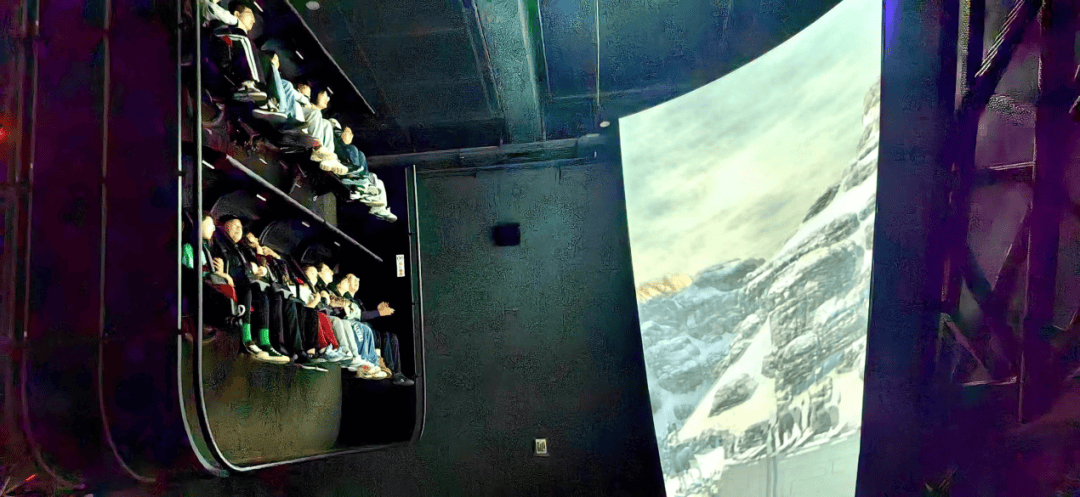 位于地下一层西南角。采用6自由度及可前倾翻转飞行平台技术,影院立式球冠银幕垂直弦长9米,水平14米,配备5.1声道立体环绕音响。