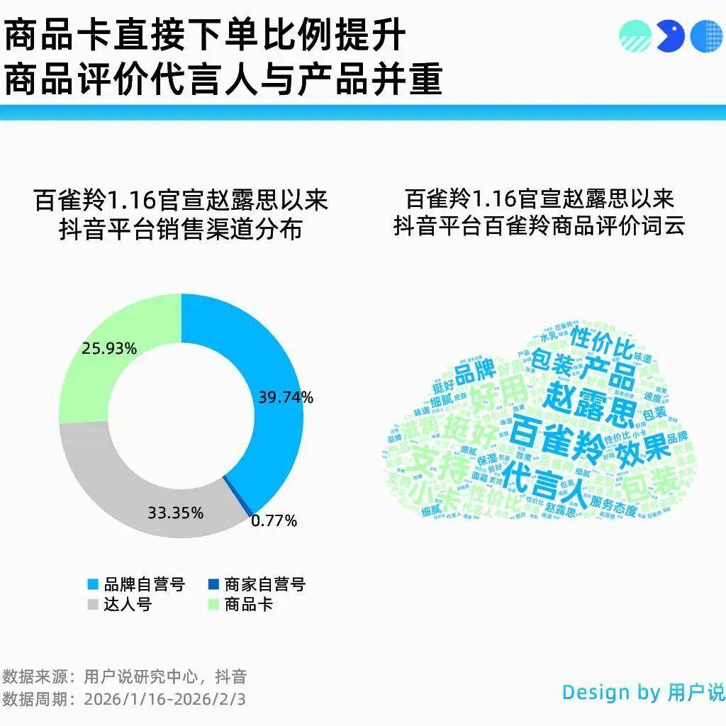 更值得关注的是渠道结构的优化,这直接反映品牌心智的强化。2025年全年,百雀羚抖音渠道44%以上销售额来自品牌自营账号,仅13.15%来自商品卡;而代言后商品卡成交比例攀升至25.93%,意味着品牌知名度与用户主动选择意愿显著提升,流量正转化为品牌自身的心智资产。
