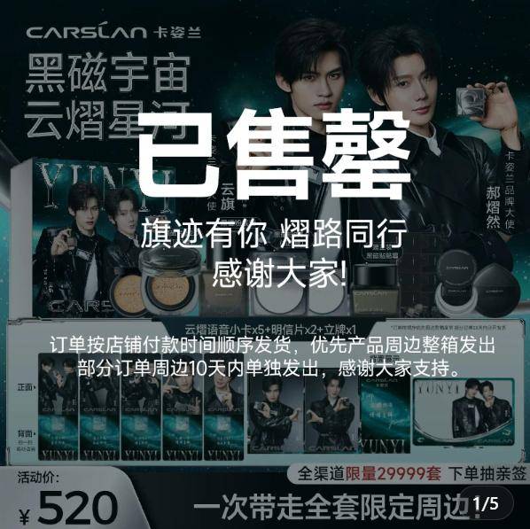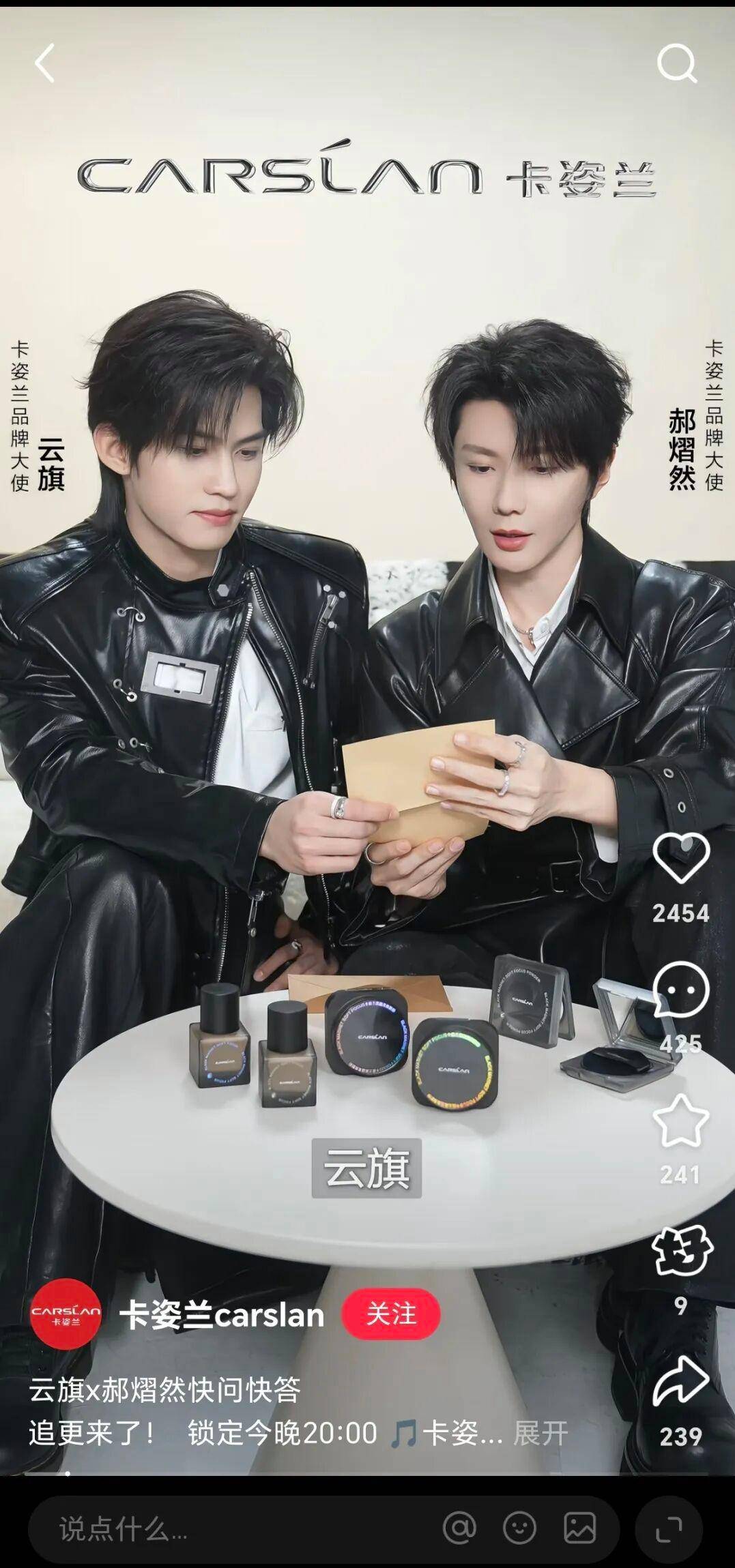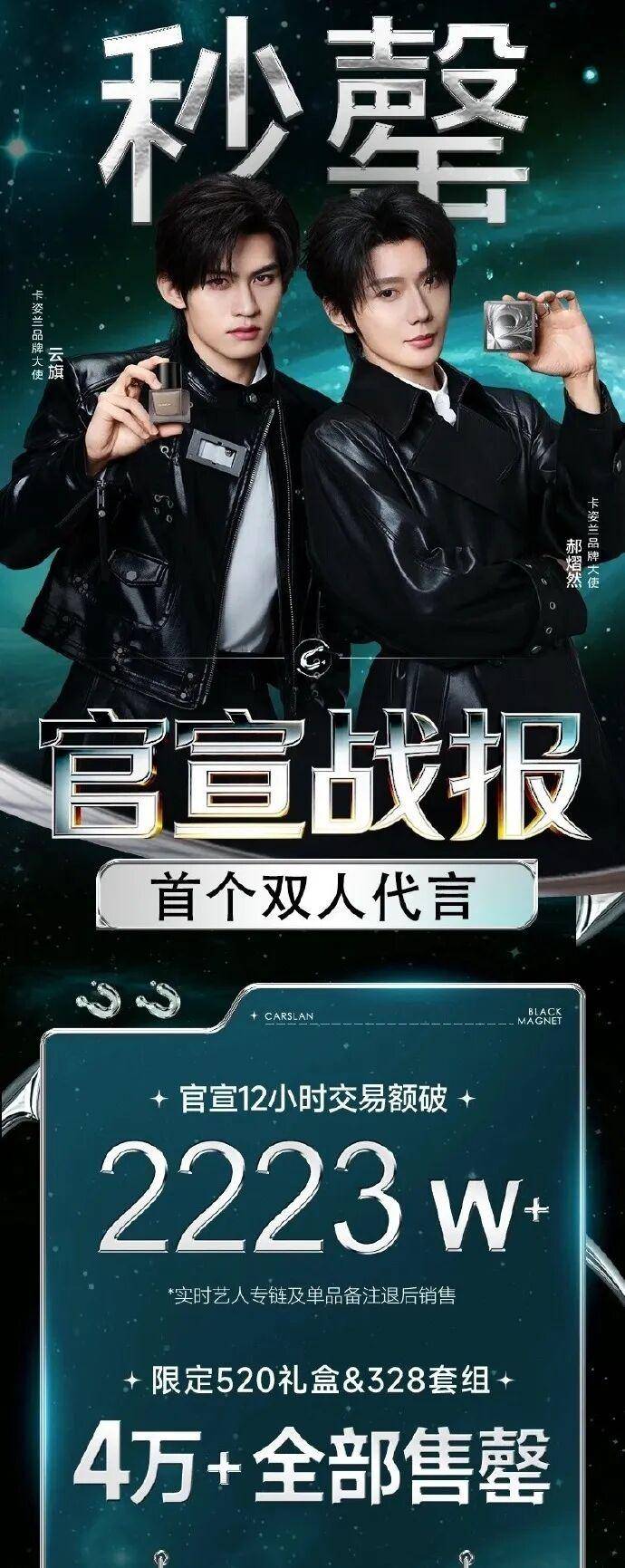 1月26日,卡姿兰官宣云旗、郝熠然为品牌青春大使,官宣12小时内销售额突破2223万,限定520礼盒与328套盒共计4万件全部售罄,登顶微博、抖音、京东、天猫多平台榜单第一。截至发稿,云旗微博粉丝仅58.4万,郝熠然粉丝数102万,但二人的带货能力却比肩顶流。