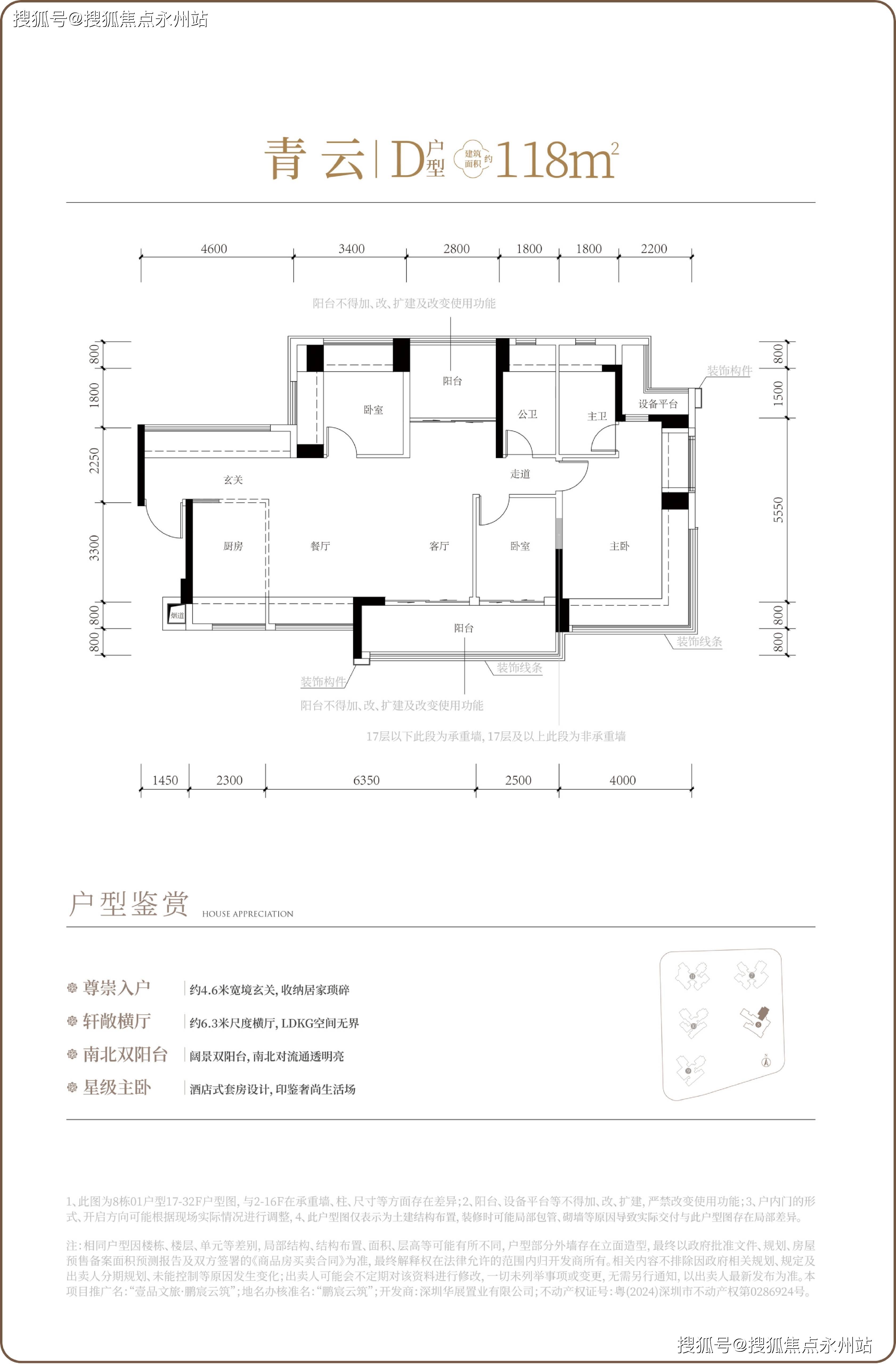 格局:横厅设计,约 4.6 米玄关收纳空间,南北双阳台对流,主卧套房带步入式衣帽间。