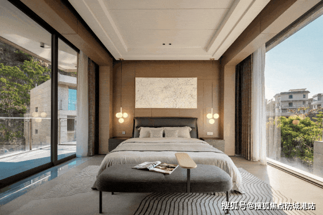 该户型采用向心围合布局,经过精准角度扭转,确保无遮挡视野,推窗即可俯瞰南湖与白云山景观。室内采用法式浪漫设计风格,打造“水晶玻璃盒”式空间,客厅、餐厅、主卧、次卧等主要空间均配备两面以上采光,负一层引入采光天井,让阳光与清风贯穿全屋,记录“光的行走印记”。主卧设计极具仪式感,进门两侧配备超大步入式衣帽间,廊道铺设星光红毯,尽头为睡眠区,搭配落地玻璃窗与简洁天花,营造出自然流畅的空间质感。